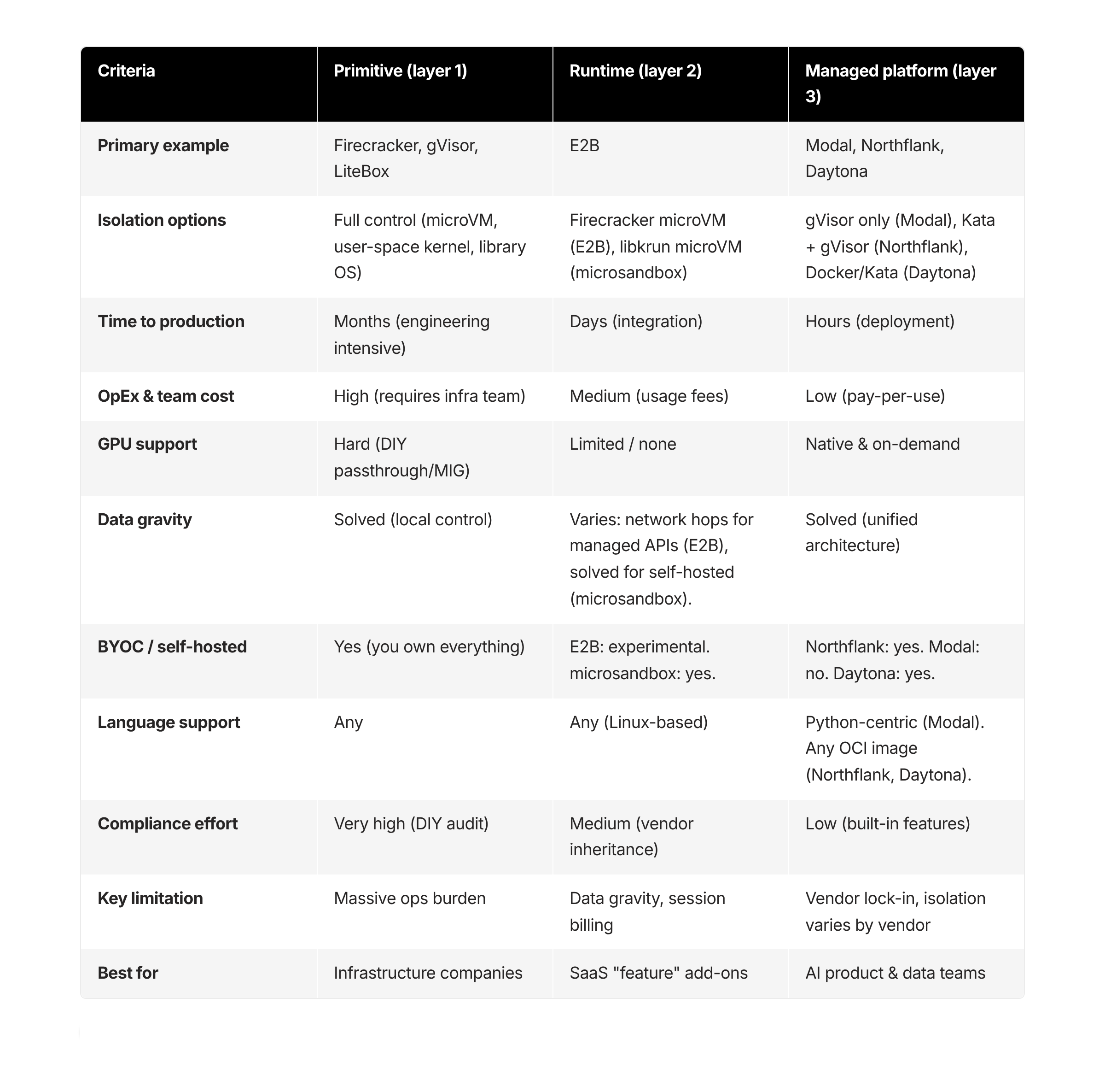 If your core business is building an AI application, agent, or data pipeline, managed platforms (Layer 3) trade control for velocity. But “managed” is not a monolith — evaluate isolation strength (gVisor vs. microVM), deployment model (managed vs. BYOC), language constraints, and session economics for your specific workload before committing.